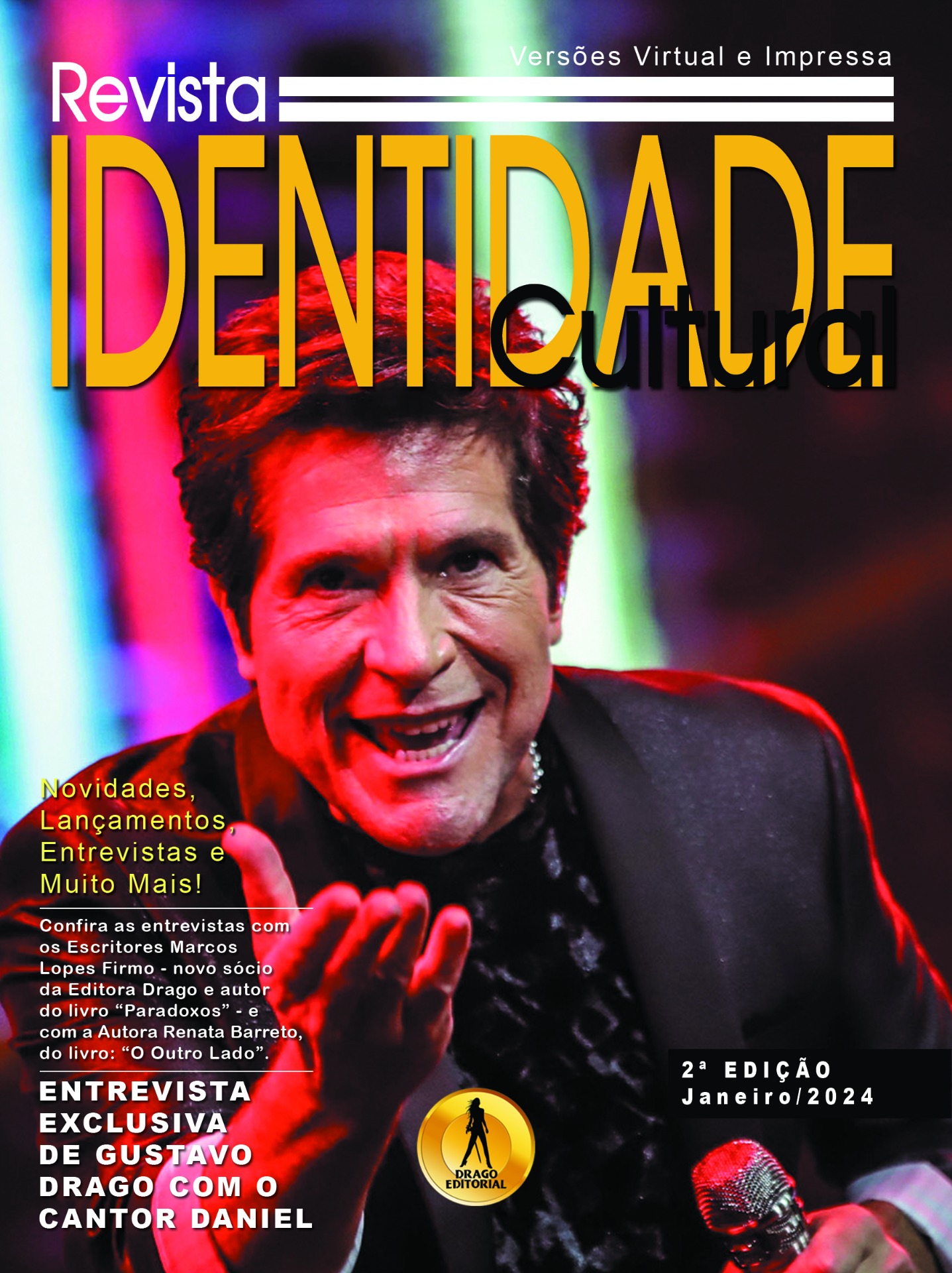 A 2ª Edição da nossa Revista Identidade Cultural vem recheada de novidades e entretenimento. Como matéria de capa tem uma entrevista exclusiva com o cantor Daniel, ícone da música brasileira. Daniel falará das suas tristezas e alegrias ao longo de 33 anos de carreira. Nesta edição, ainda traremos uma super entrevista com nossa Autora Renata Barreto, autora do livro "O Outro Lado". E, claro, haverá muita dica de leitura... vocês não perdem por esperar! Estimamos distribuição de mais de 100 mil unidades, entre versões impressa e virtual.
